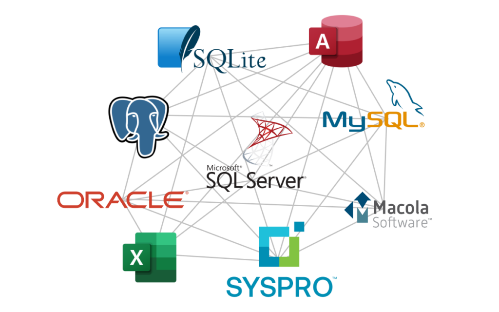 BLR Rosetta connects to a wide variety of data sources, including SQL Server, Oracle, Access, Excel, and many other industry standard databases. It can connect to data on your local drive, network, cloud database or through via web services.